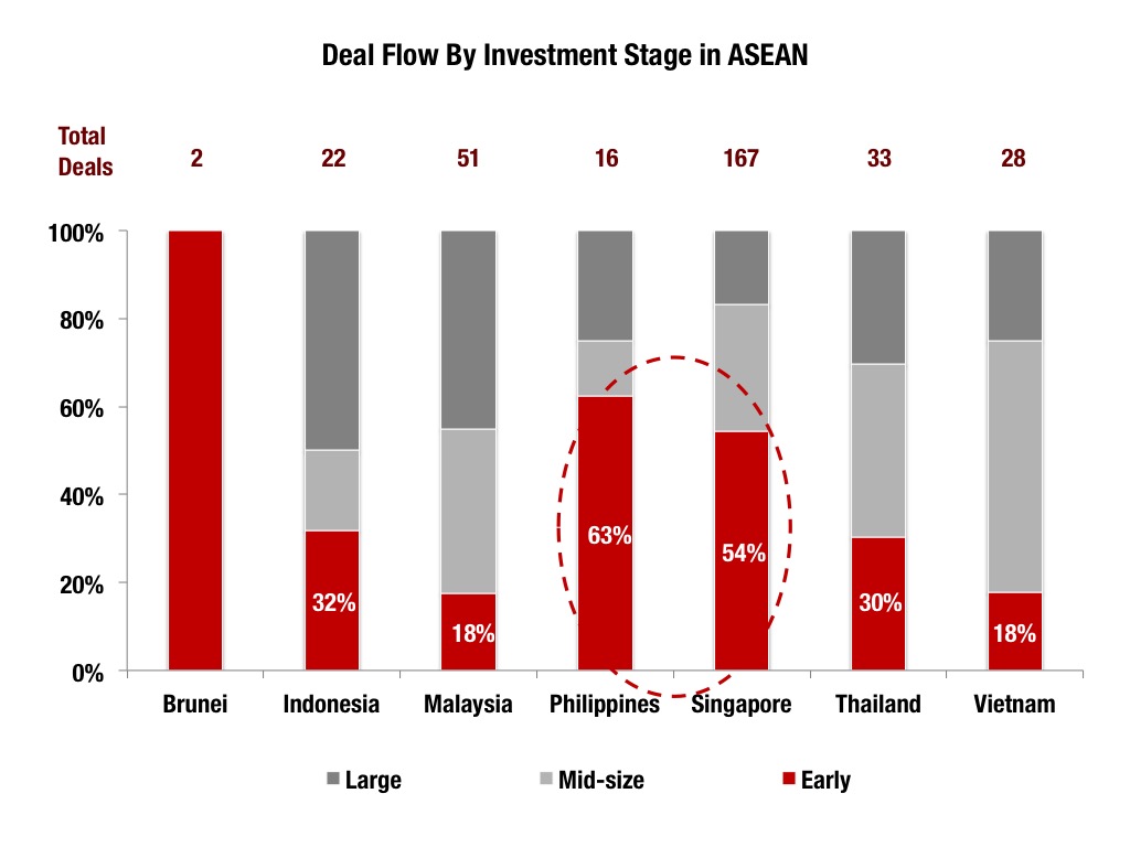 Philippines and Singapore have the highest share of early stage deals as % of their respective totals. Malaysia and Vietnam at 18% have the lowest share of early stage deals as % of their respective totals. This correlates to the higher share of consumer focused large size deals in these 2 countries.